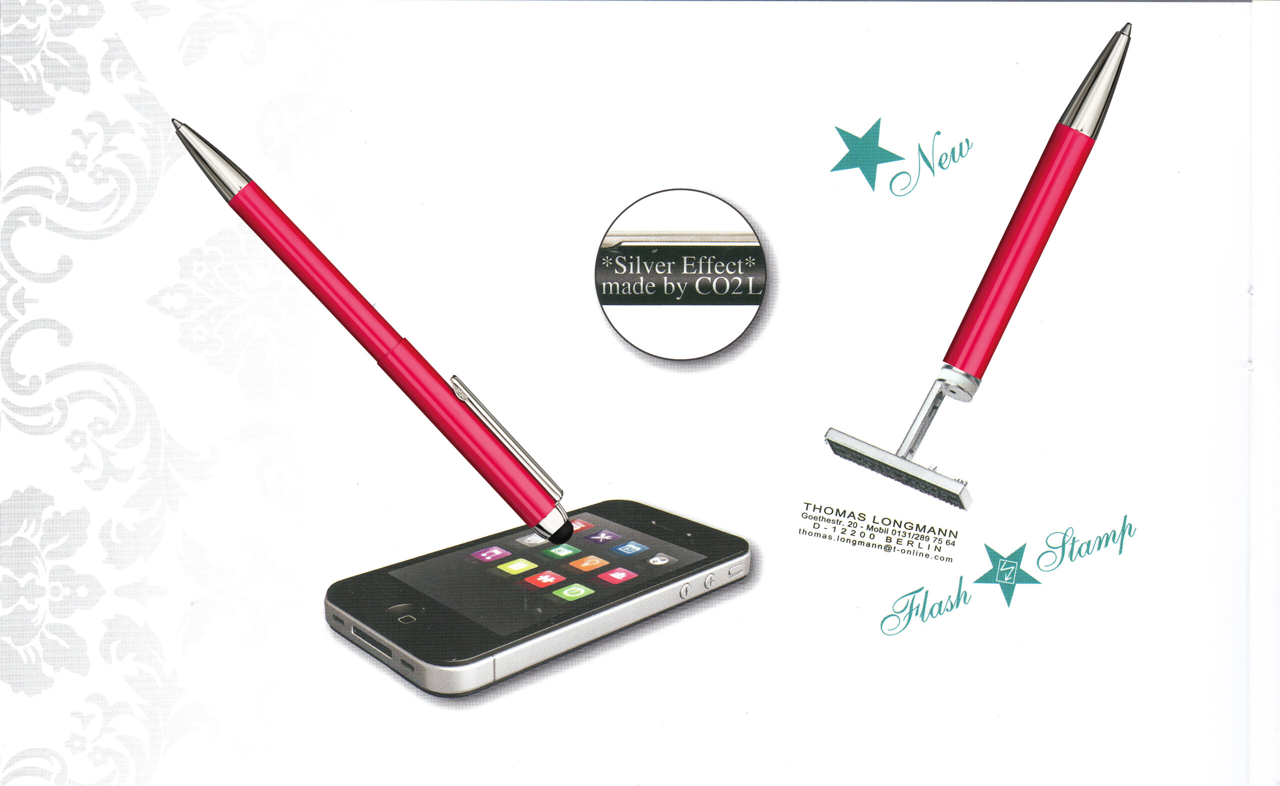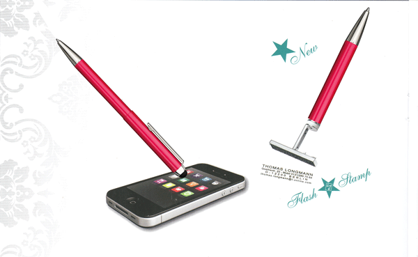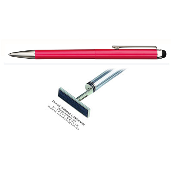 Elegant 3-in-1 pen combining writing, stamping and touchscreen use — made in Germany with precision metal mechanics and integrated ink pad.
